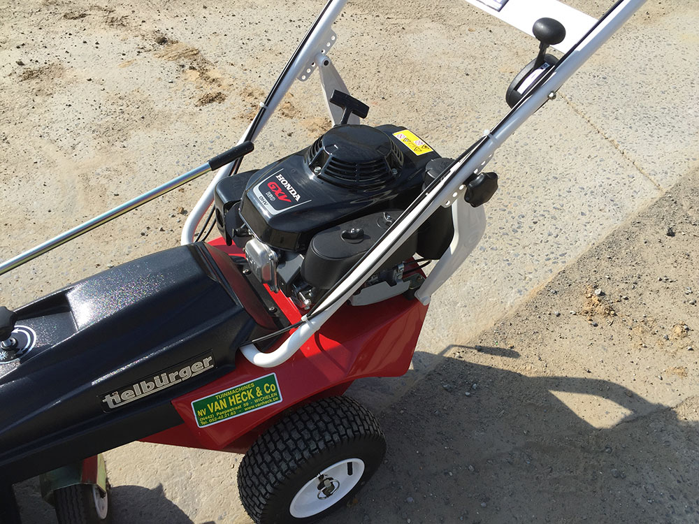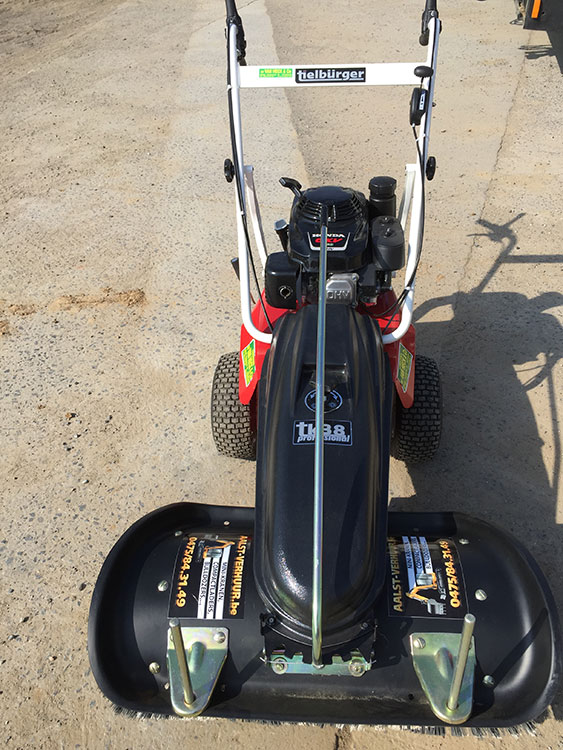 Gemotoriseerde veegmachine waarmee je ongeveer 3500 m2 in een uur tijd schoonveegt, zelfs zwaar materiaal zoals puin of sneeuw.